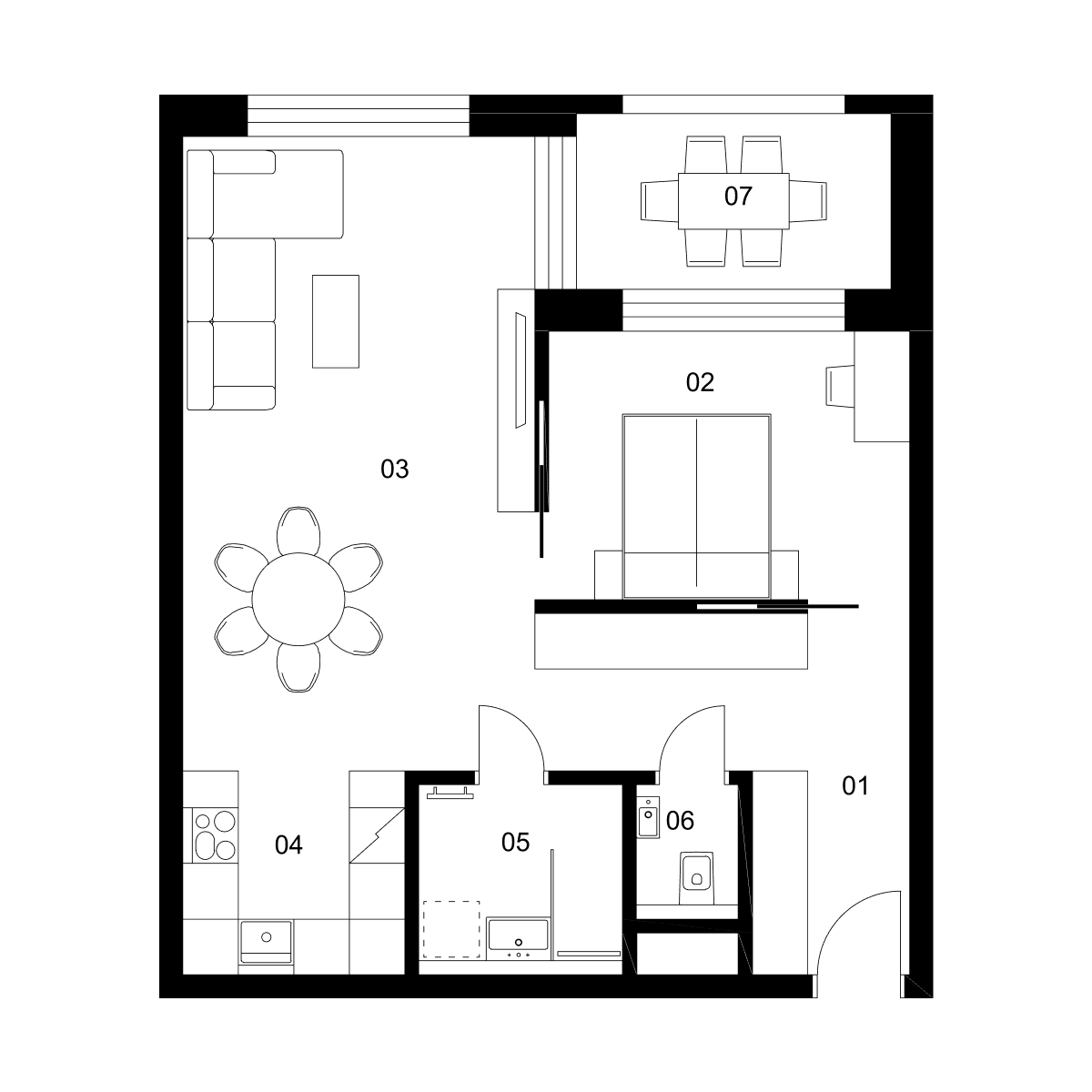 Variant E 01 je originálny a najprepracovanejší pôdorys tohto bytu. Tento variant je navrhnutý pre náročných klientov, ktorí majú jasno v otvorenosti a vidia svoj potenciál v tejto dispozícii.