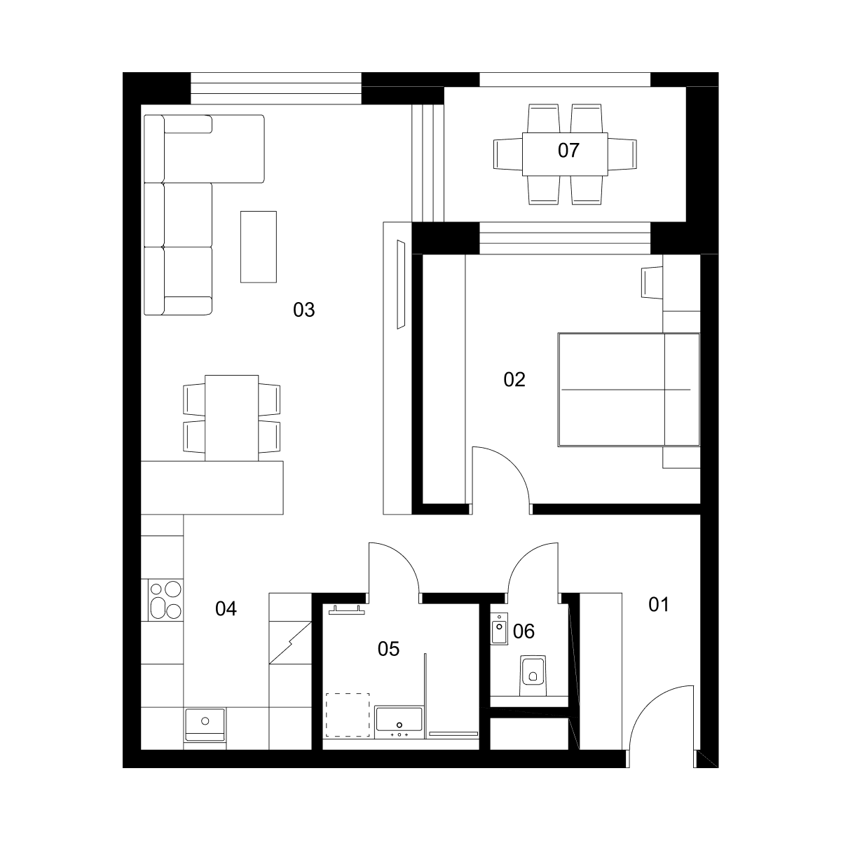 Variant A 01 ponúka zádverie s prehľadným úložným systémom a kúpeľňu so sprchovacím kútom. Ideálny pre tých, ktorí milujú minimalizmus a preferujú rýchly a bezbariérový pohyb po byte.