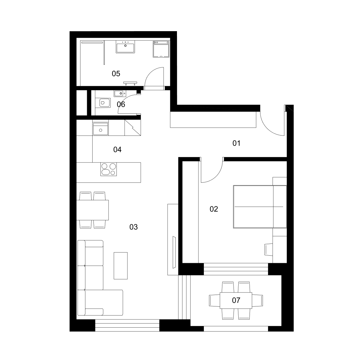 Pôdorysný variant A 01 s kúpeľňou so sprchovacím kútom a praktickým zádverím s úložným priestorom. Ideálny pre tých, ktorí preferujú rýchlu a efektívnu údržbu bytu.