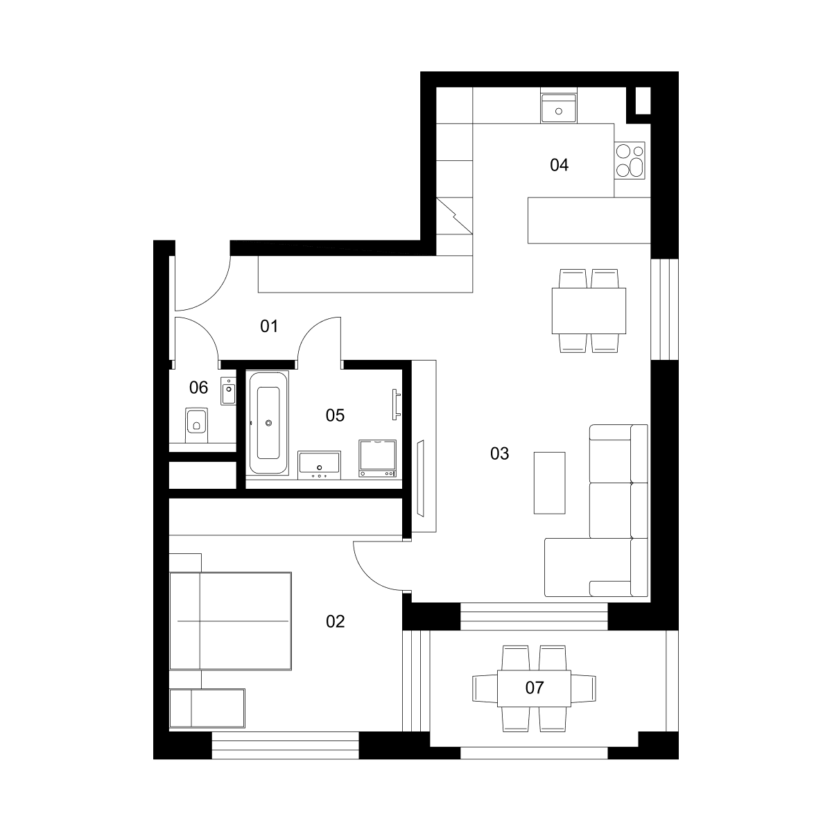 Variant C 02 je vhodný pre jednotlivcov aj mladé páry, ktoré očakávajú prírastok do rodiny. Ponúka kombináciu vane a viacúčelovej zóny v spálni, kde je navrhnutá postieľka. V kúpeľni je vaňa praktická, ktorá sa osvedčí aj pri kúpaní bábätka a údržbe bytu. Do chodby je možné pohodlne odložiť kočík.