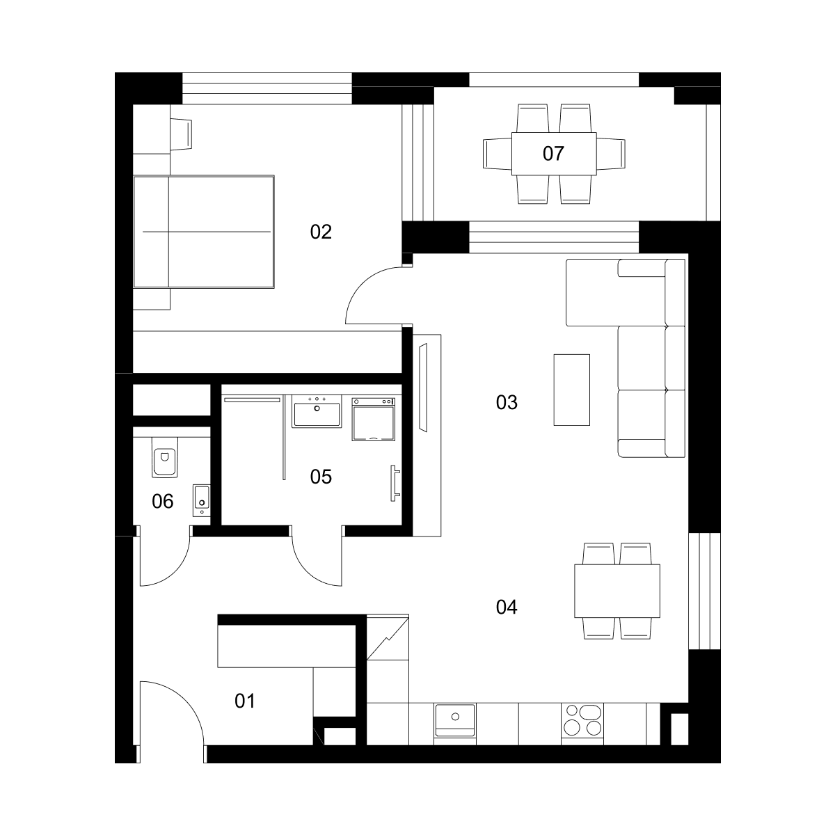 Variant A 01 ponúka sprchovací kút a veľkorysé zádverie s prehľadným úložným systémom. Je ideálny pre tých, ktorí preferujú rýchly a bezbariérový pohyb po byte. Okno v jedálni a v blízkosti kuchyne poskytuje prirodzenú ventiláciu a väčšiu svetelnosť, čo zvyšuje komfort bývania.