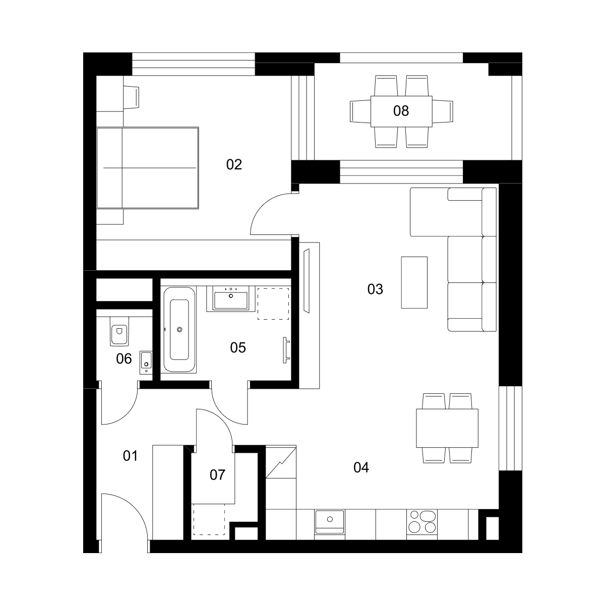 Variant B 02 je vhodný pre jednotlivcov aj mladé páry, ktoré očakávajú prírastok do rodiny. Tento variant ponúka kombináciu vane a viacúčelovej zóny v spálni, kde je navrhnutá postieľka. V kúpeľni je vaňa praktická, osvedčí sa aj pri kúpaní bábätka a údržbe bytu. Do chodby je možné pohodlne odložiť kočík. Okno v jedálni a v blízkosti kuchyne poskytuje prirodzenú ventiláciu a väčšiu svetelnosť, čo zvyšuje komfort bývania.