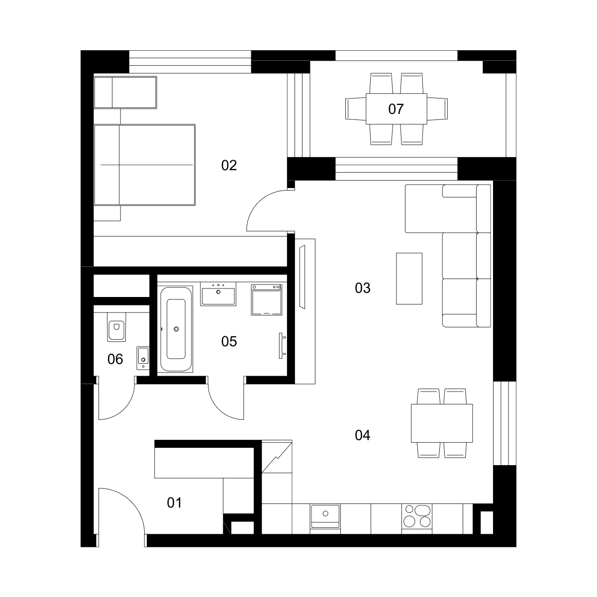 Variant C 02 je vhodný pre jednotlivcov aj mladé páry, ktoré očakávajú prírastok do rodiny. Tento variant ponúka kombináciu sprchy a viacúčelovej zóny v spálni, kde je navrhnutá postieľka. V kúpeľni je priestor pre práčku a sušičku a komfortný sprchovací kút. V chodbe zaparkujete kočík. Okno v jedálni a v blízkosti kuchyne poskytuje prirodzenú ventiláciu a väčšiu svetelnosť, čo zvyšuje pohodlie bývania