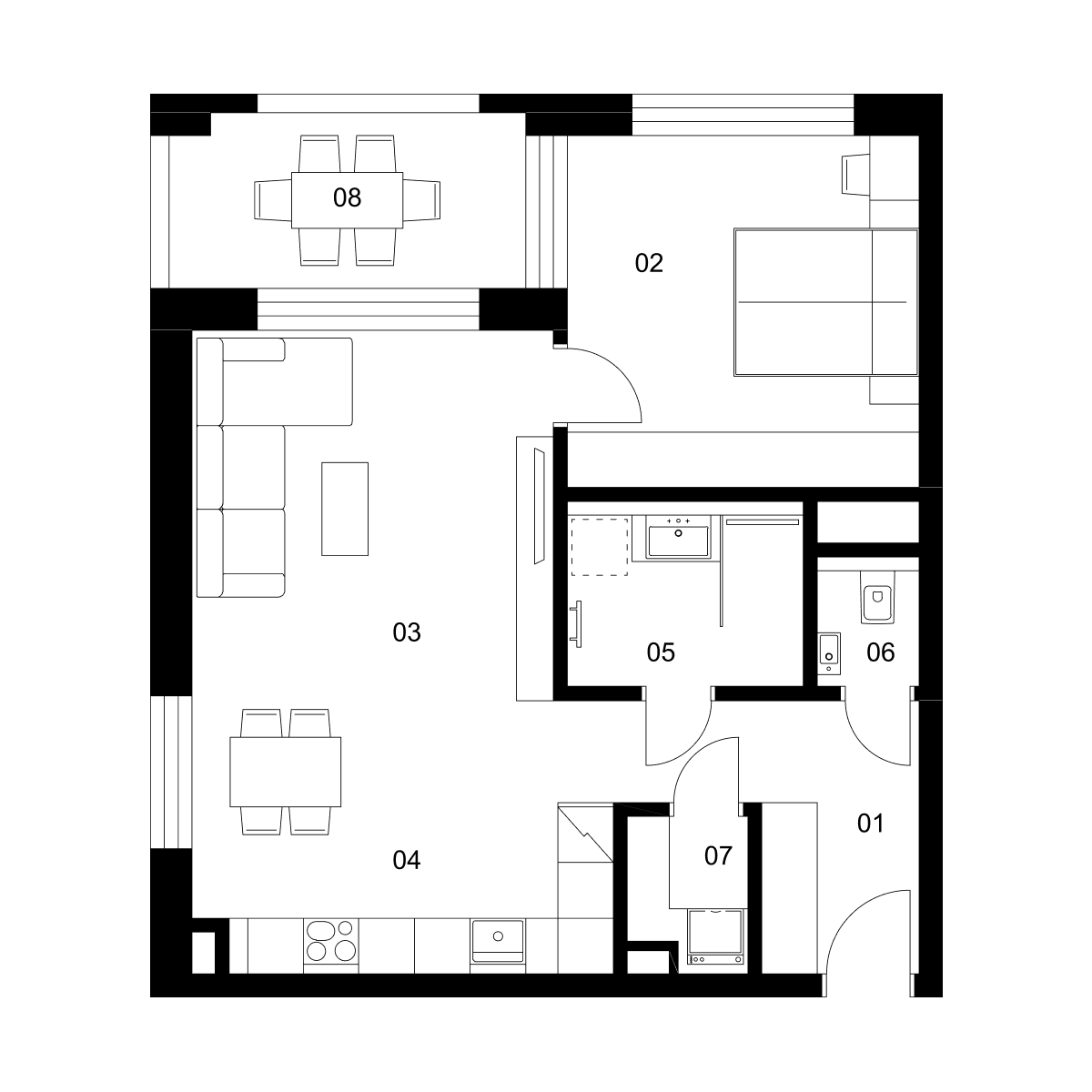 Variant B 01 je určený pre tých, ktorí preferujú sprchovací kút a praktické riešenia úložného priestoru. Účelové zádverie a viacúčelový sklad, ktorý môže slúžiť ako šatník, práčovňa a sušiareň, zabezpečujú maximálnu funkčnosť. Okno v jedálni a v blízkosti kuchyne poskytuje prirodzenú ventiláciu a väčšiu svetelnosť, čo zvyšuje pohodlie bývania.