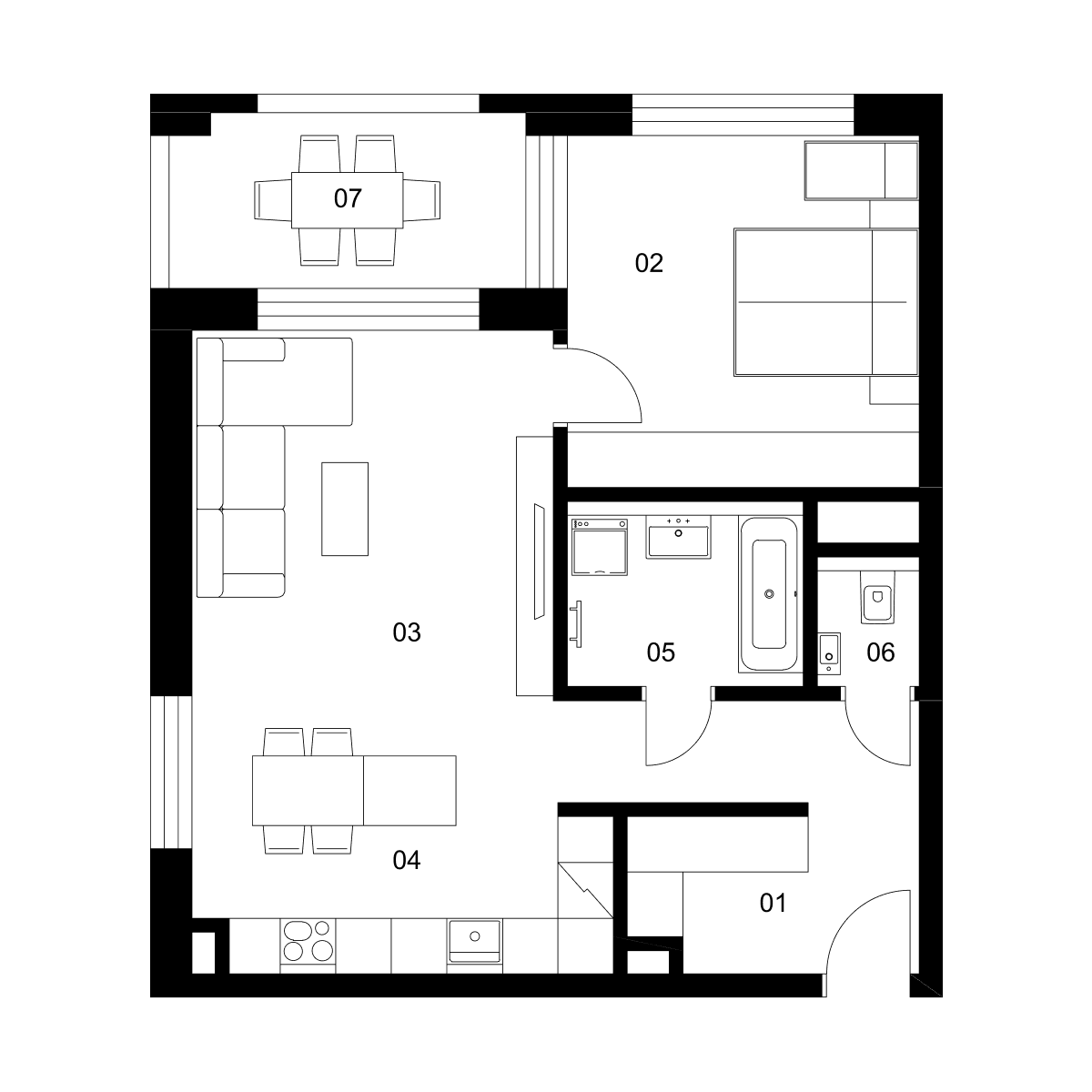 Variant C 02 je vhodný pre jednotlivcov aj mladé páry, ktoré očakávajú prírastok do rodiny. Tento variant ponúka kombináciu vane a viacúčelovej zóny v spálni, kde je navrhnutá postieľka. V kúpeľni je vaňa, ktorá sa osvedčí aj pri kúpaní bábätka a údržbe bytu. Do chodby je možné pohodlne odložiť kočík. Okno v jedálni a v blízkosti kuchyne poskytuje prirodzenú ventiláciu a väčšiu svetelnosť, čo zvyšuje komfort bývania.