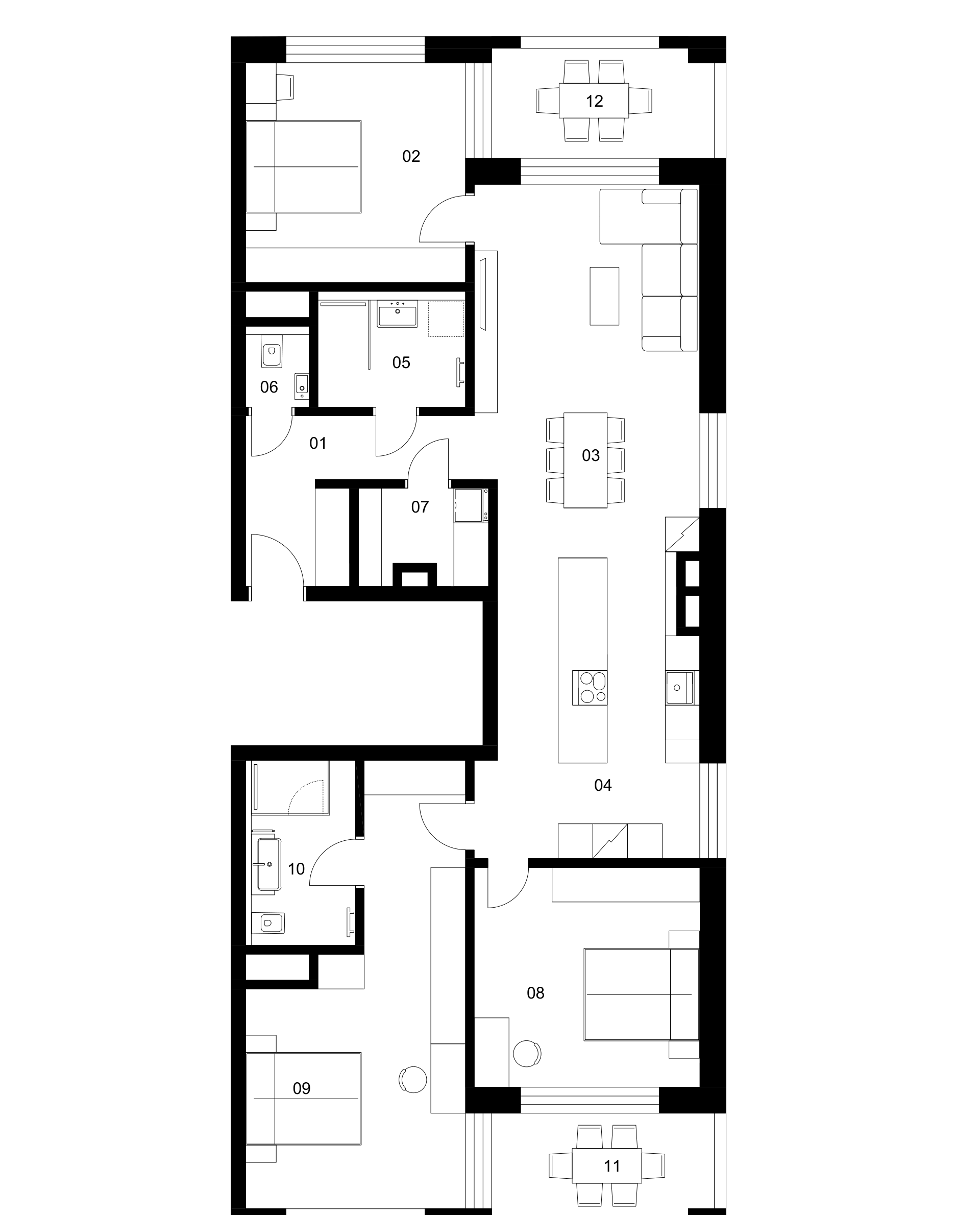 Prepracovaná dispozícia variantu E 01 s dôrazom na komfort a exkluzivitu ponúka dve kúpeľne so sprchovacími kútmi. Zažite prémiovosť hotelovej Executive Suite priamo doma s hlavnou spálňou, vlastným balkónom, privátnou kúpeľňou a šatníkovou miestnosťou. Kvalitu zázemia dopĺňa pracovňa. Tento multifunkčný priestor je pripravený splniť všetky vaše požiadavky a prispôsobiť sa vášmu životnému štýlu, či už pracujete z domu, alebo potrebujete miesto na svoje koníčky a záujmy.