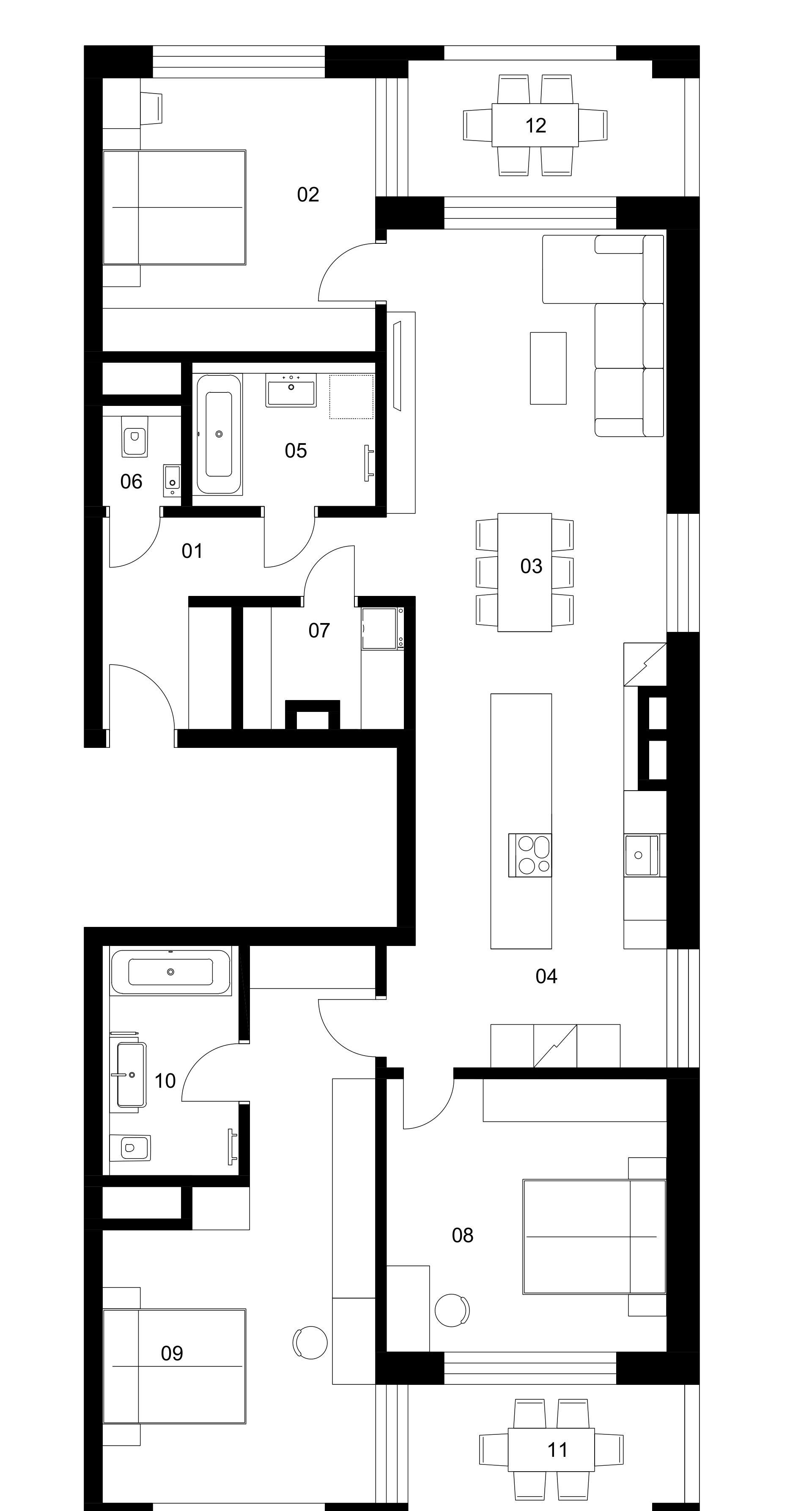 Prepracovaná dispozícia variantu E 02 s dôrazom na komfort a exkluzivitu ponúka dve kúpeľne s vaňami. Zažite prémiovosť hotelovej Executive Suite priamo doma s hlavnou spálňou, vlastným balkónom, privátnou kúpeľňou a šatníkovou miestnosťou. Kvalitu zázemia dopĺňa pracovňa. Tento multifunkčný priestor je pripravený splniť všetky vaše požiadavky a prispôsobiť sa vášmu životnému štýlu, či už pracujete z domu, alebo potrebujete miesto na svoje koníčky a záujmy.