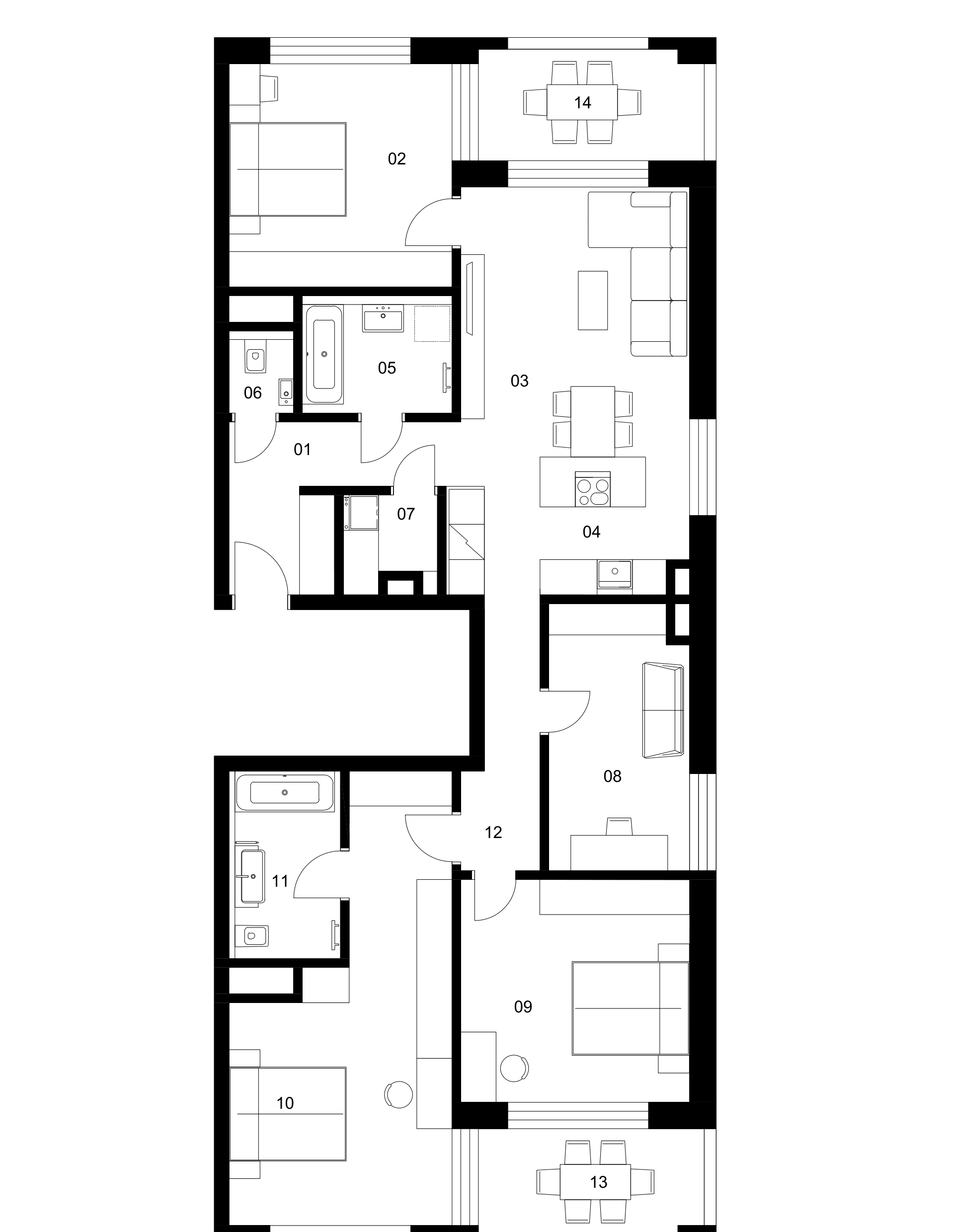 Prepracovaná dispozícia variantu E 02 s dôrazom na komfort a exkluzivitu ponúka dve kúpeľne s vaňami. Zažite prémiovosť hotelovej Executive Suite priamo doma s hlavnou spálňou, vlastným balkónom, privátnou kúpeľňou a šatníkovou miestnosťou. Kvalitu zázemia dopĺňa pracovňa. Tento multifunkčný priestor je pripravený splniť všetky vaše požiadavky a prispôsobiť sa vášmu životnému štýlu, či už pracujete z domu, alebo potrebujete miesto na svoje koníčky a záujmy.