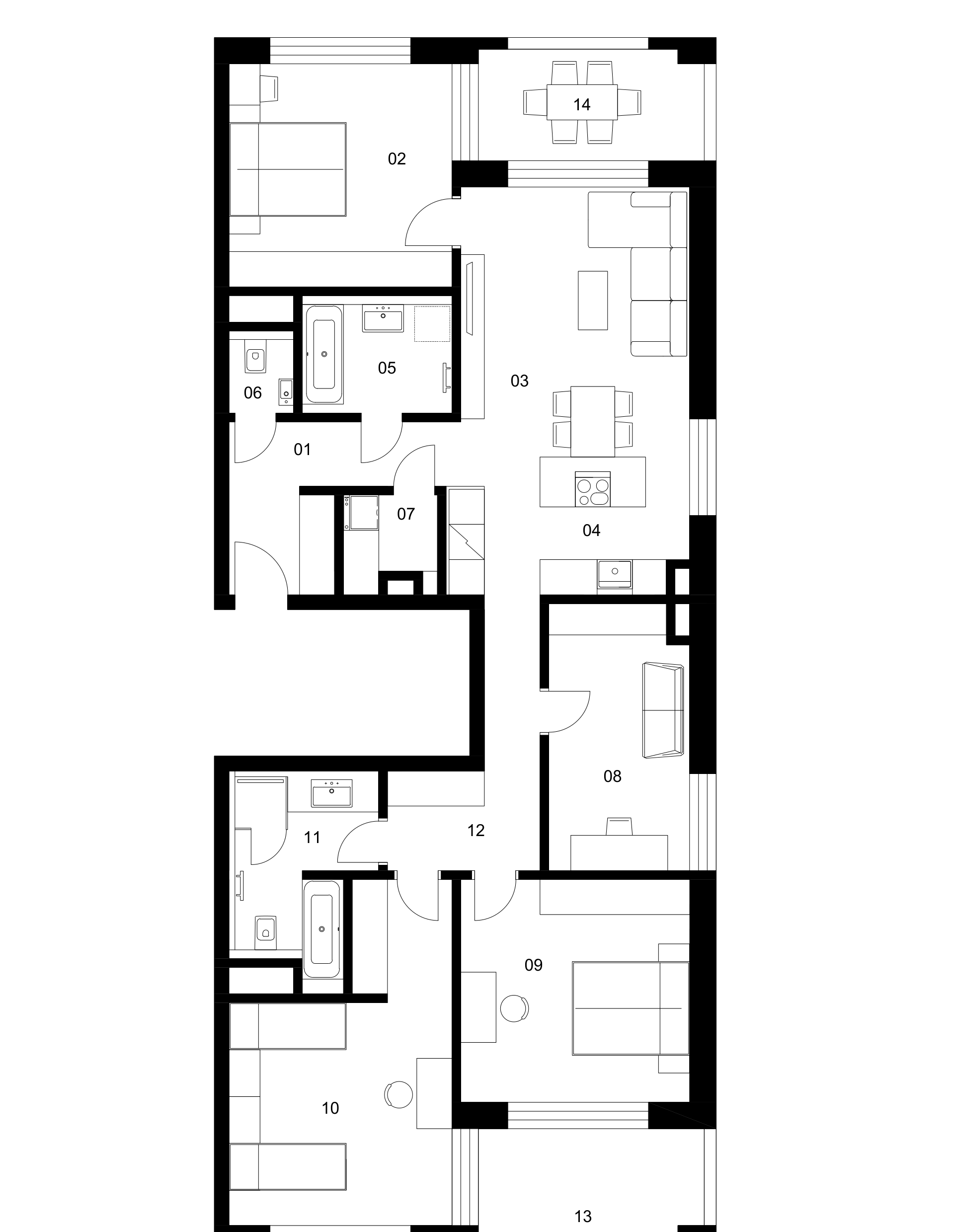 Variant A 03 ponúka kúpeľne so sprchovacími kútmi a vaňou, praktické zádverie s úložným priestorom a viacero priestranných izieb, kde okrem spálne a detskej izby nájdete aj modernú pracovňu. Tento multifunkčný priestor je pripravený splniť všetky vaše požiadavky a prispôsobiť sa vášmu životnému štýlu, či už pracujete z domu, alebo potrebujete miesto na svoje koníčky a záujmy.